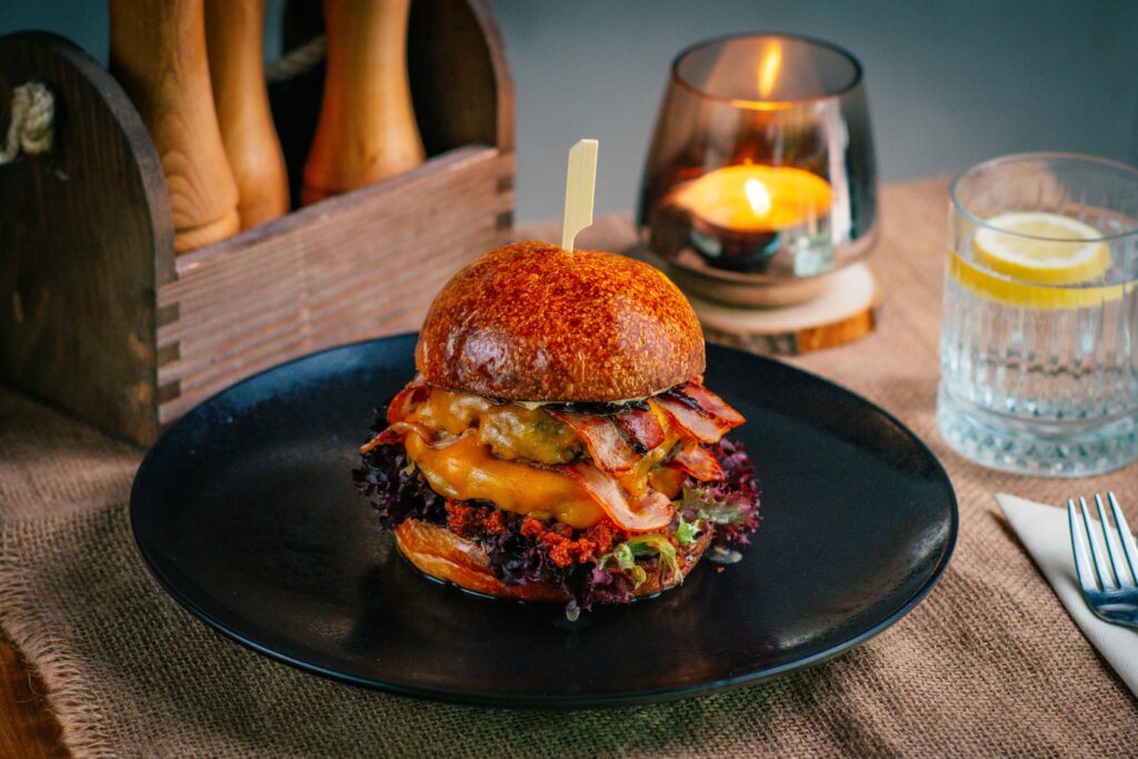 s domácou slaninovou majonézou, syrom cheddar, slaninou, cibuľovým chutney, kyslou uhorkou a pestom zo sušených paradajok, 300/100 g, obsahuje: 1,3,7