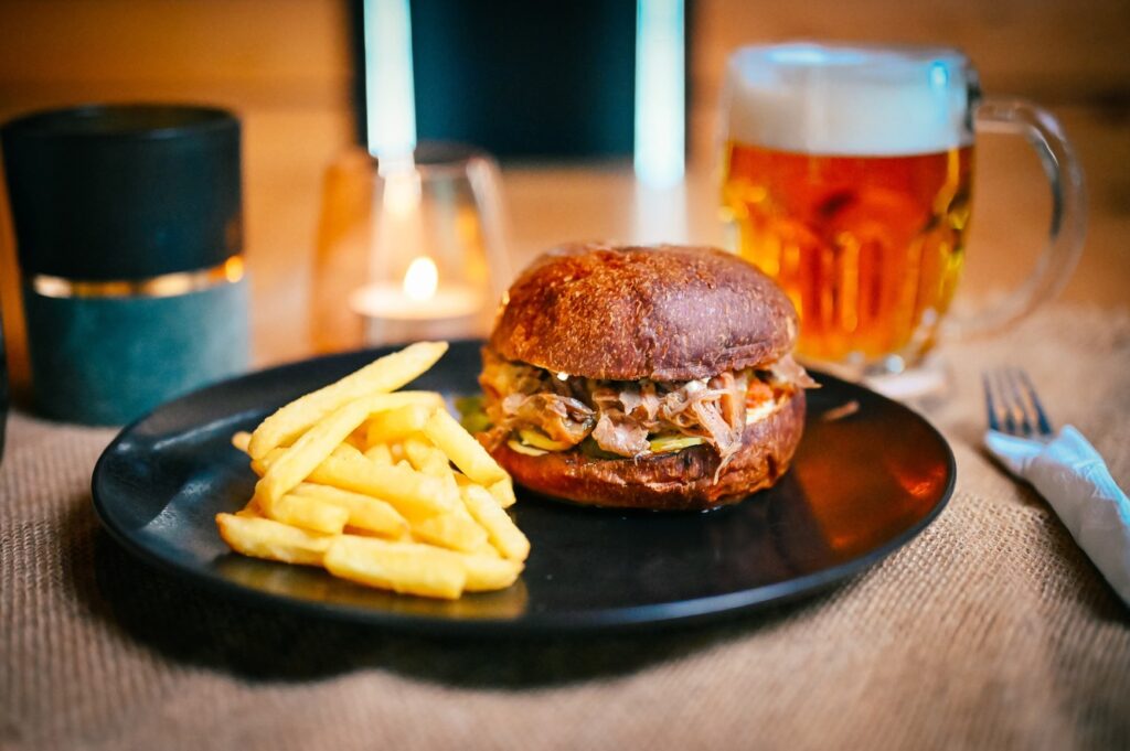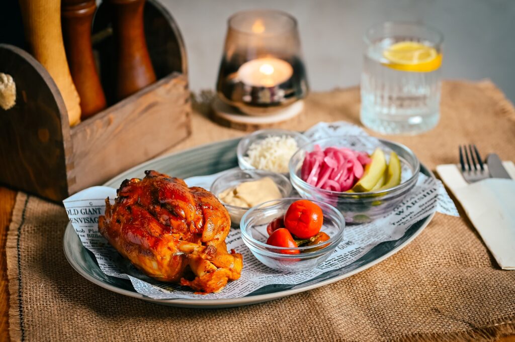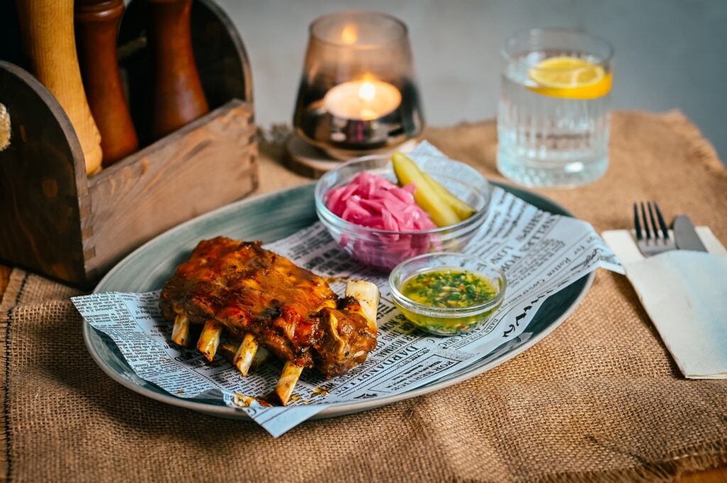 na čiernom pive a mede, kyslá uhorka, nakladaná cibuľa a chimichurri, 500/150 g