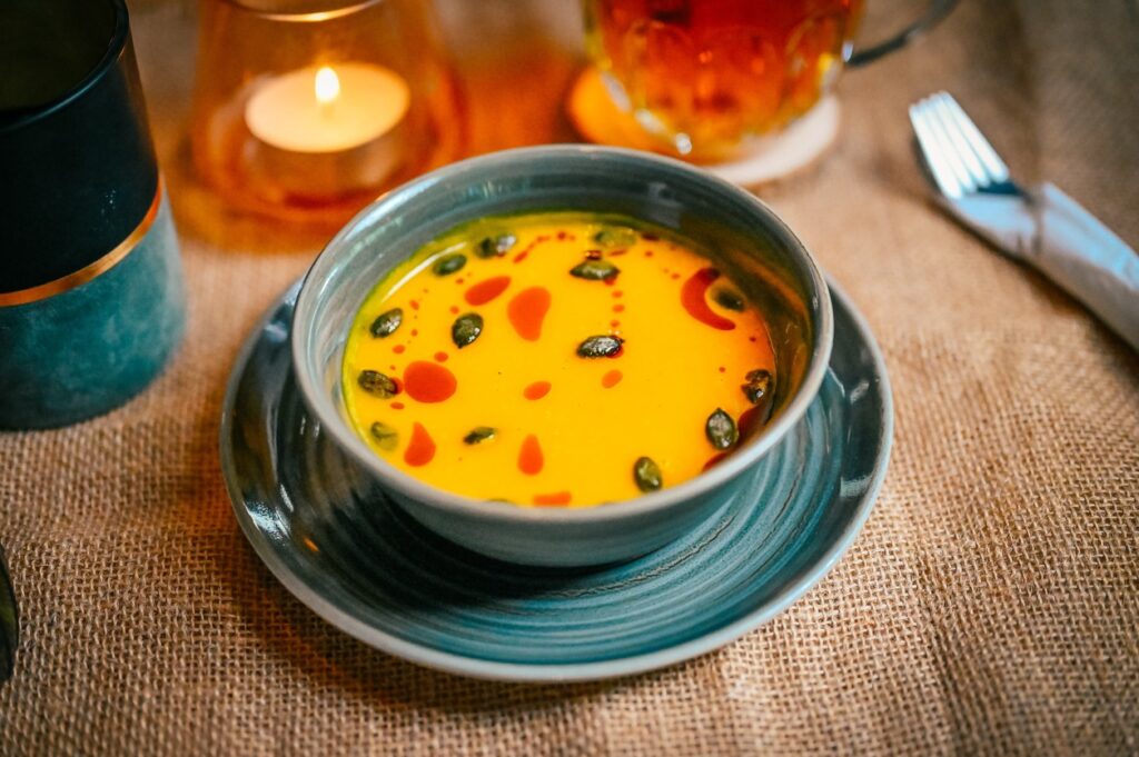 Pondelok: Karfiolová krémová s mrkvou a kôprom (1,7) // Utorok: Držková polievka // Streda: Zeleninový vývar, halušky (1,3,9) // Štvrtok: Boršč (7,9) // Piatok: Kulajda (1,3,7)